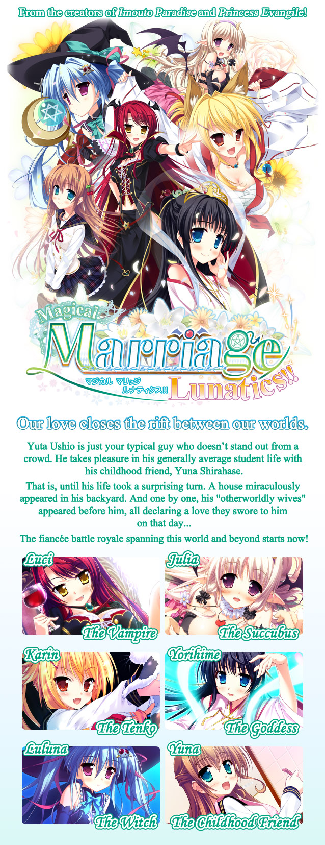 ---Complaints--- -Luci and Yorihime are the only two you actually get to see in a wedding dress. The video above implied I might get to see more of the MARRIAGE part, but no. I had expectations from such a title. -When you pick a girl, you REALLY pick them. Only a couple paths have more than cameos from the rest after you chose, diminishing the atmosphere of camaraderie. -Karin is sometimes a little too dumb, to a frustrating extent. -It's never explained WHY it's so hard for some races to cross into other worlds. -If you choose anyone but Yuna, there's a period of time where the plot demands they leave to their world for a excruciatingly long time. It feels contrived because they go from going through the game day by day, to skipping around a little, to full on skipping whole months at a time and I feel like I could have had more slice of life fun with the others in the meantime, but no. -Kind of on the same note. A summit is mentioned multiple times, an annual event when the princesses would NORMALLY get to see each other. So, what happens? Could we be whisked away, letting you meet ALL the families? Maybe get a better view of otherworldly politics? Nope. -The plot demands they never get upset after the initial shock of knowing you're engaged to others. Everything is almost immediately accepted. I thought it slightly unrealistic. -No possibility of a harem route. It'd be cool to unlock a seventh path after doing all six that would forego all pacts and have a free-for-all or something. -This isn't a personal complaint, but if you wanted some H-scenes to give you some specific fetish-fulfillment, sorry. -The loud beeps in H-scenes take me out of it since the girls can't say any variation when referring to the genitals.